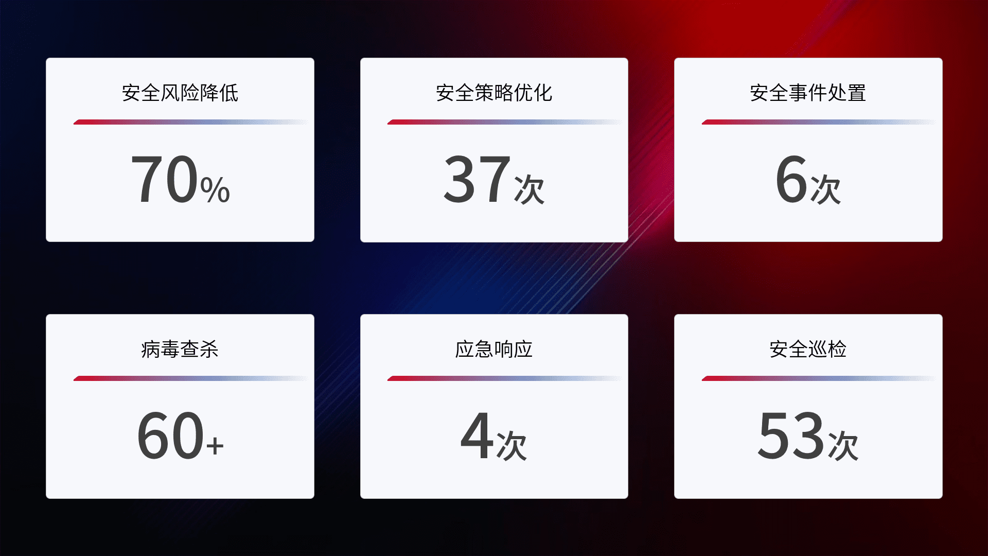 提供全面的安全事件报告体系,,,包括处置报告、、周报、、季度和年度总结,,结合持续监控,,帮助客户深入了解网络安全状况。。。