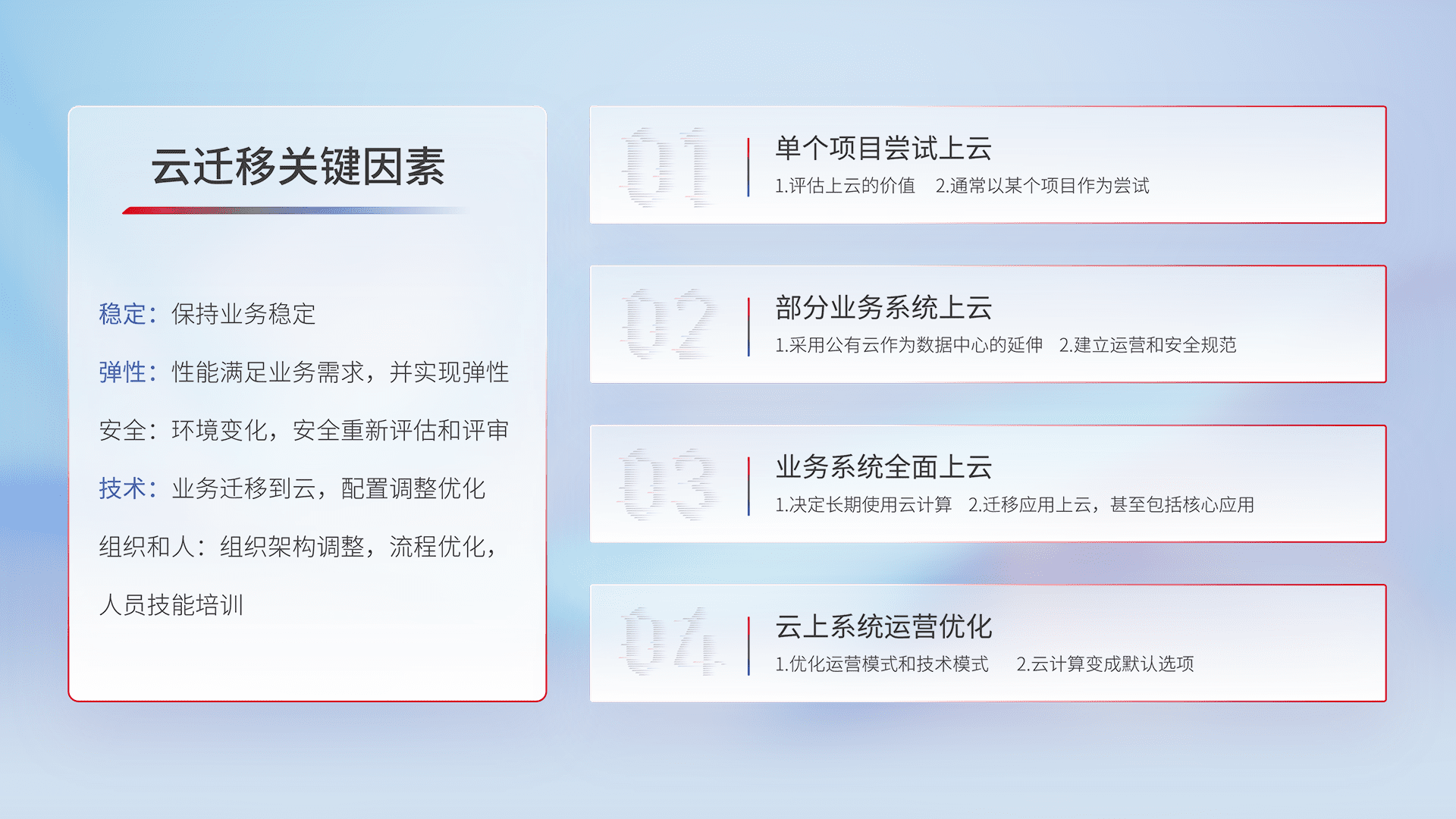 结合实际业务,,,从规划设计、、、、云平台选型、、云原生改造、、、数据迁移、、、集成交付,,,,迁移全过程为客户识别最佳上云路径,,做好风险识别管理,,,设计网络架构、、、身份权限、、、安全审计合规、、、操作审计、、、日志审计、、监控告警策略、、多站点容灾设计等,,对云上基础设施进行整体规划,,,,提升IT治理水平,,,以满足弹性、、高可用、、高性能的需求。。