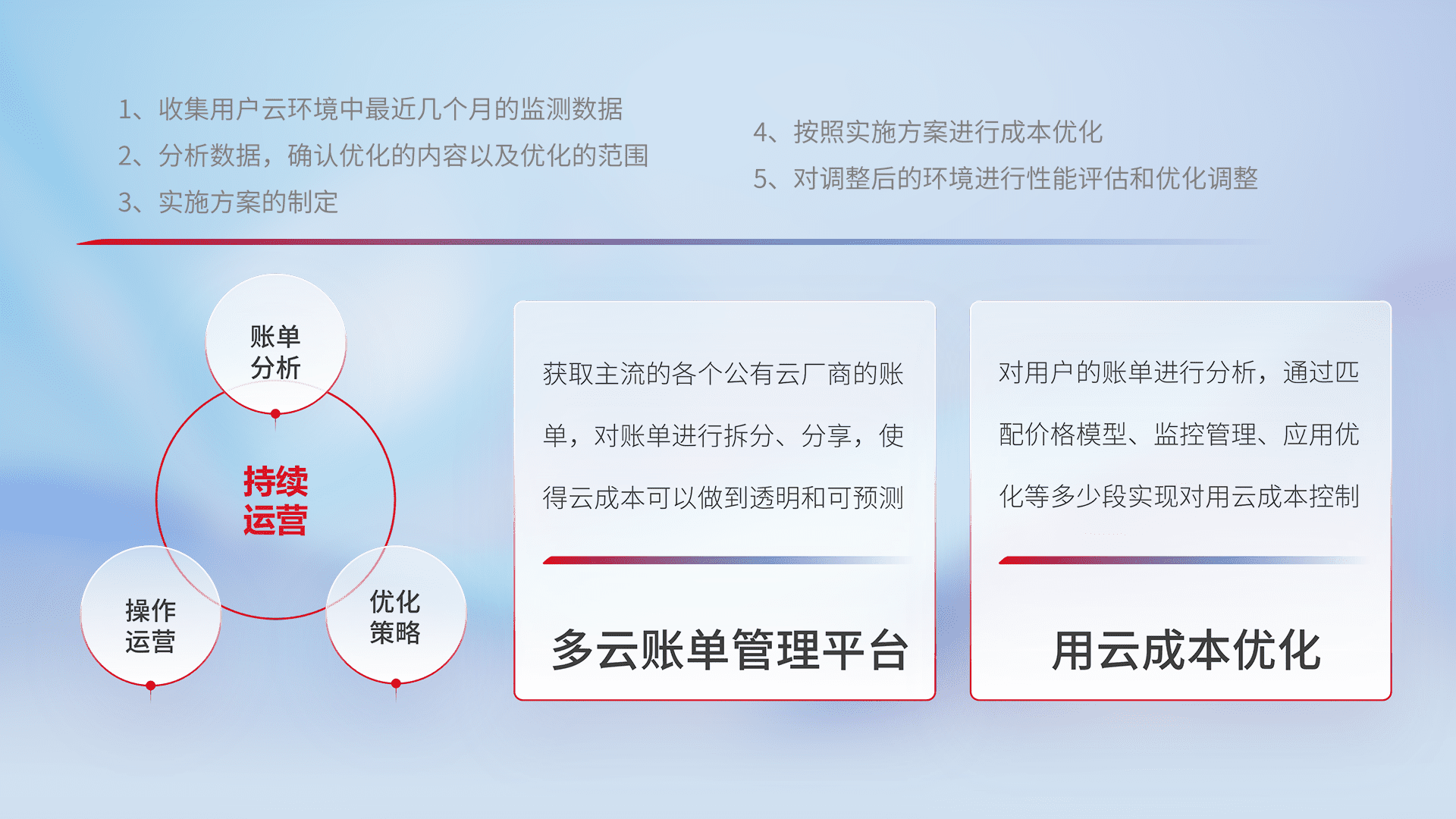 通过灵活运用多种自动化迁移工具,,帮助企业用户实现业务和数据高效 、、、稳定的上云迁移和云上迁移,,采用自研多云纳管平台,,,,以中立管理模式,,,,解决多组织、、多云、、、、多运维厂商的复杂关系的管理,,保证多云平台资源配置的一致性,,,实时掌控云资源运行数据,,,运用智能化工具分析云资源多云平台的管理服务,,,透明化管理成本支出,,,,用云成本可预测、、、、用云费用可优化、、、云资源配额有据可依。。。