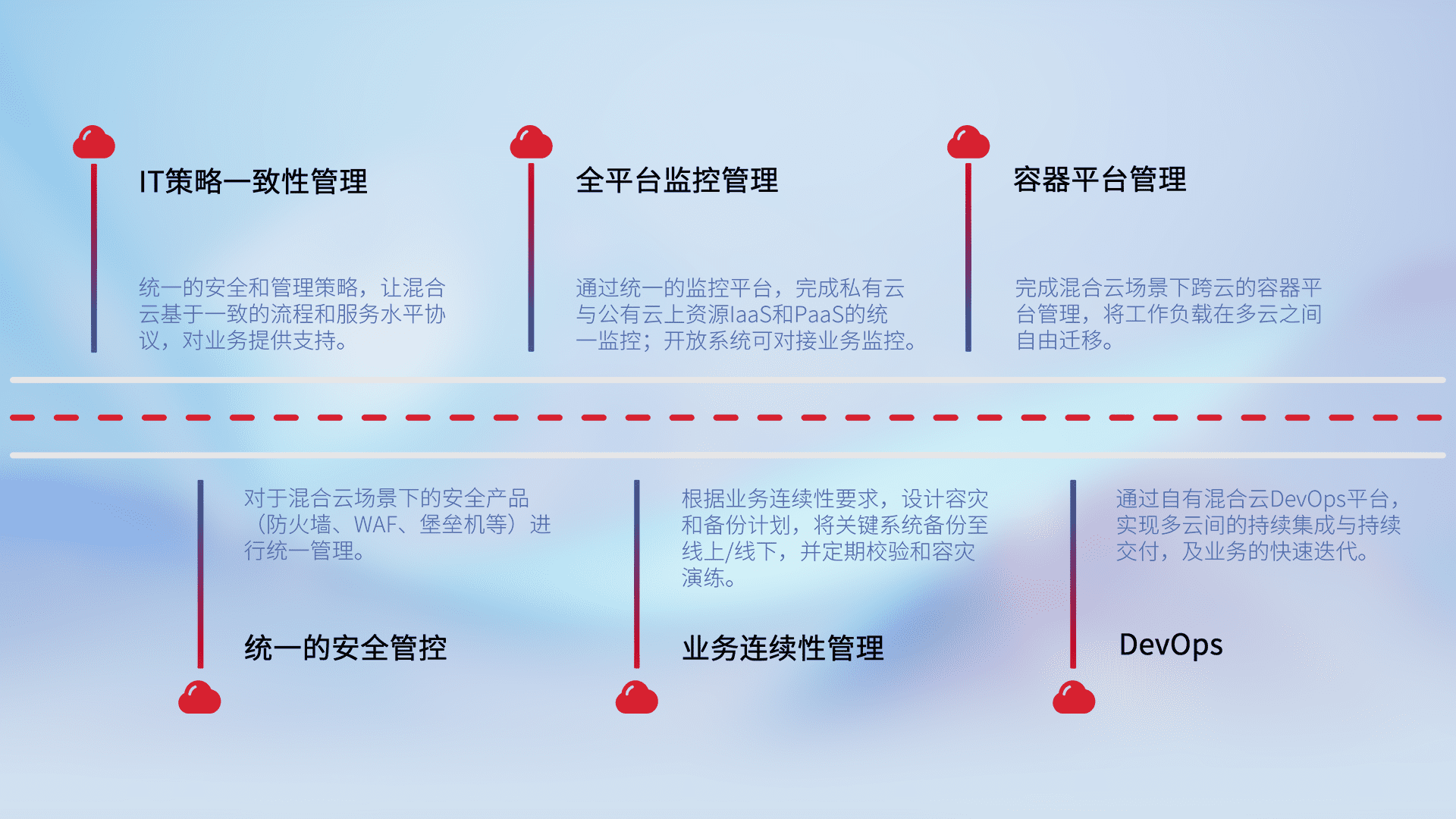 通过多云纳管,,,,以统一的资源数据模型把客户的云资源进行抽象和封装,,,,进而实现对多云资源的统一操作,,保障云资源管理的可靠性、、稳定性与可用性。。。量身定制化运维内容,,,配置、、、、开发运维、、、补丁管理、、、备份、、、监控、、认证和访问管理、、审计和日常巡检等,,保障在用云过程中的可靠度,,稳定度以及高可用率。。。。